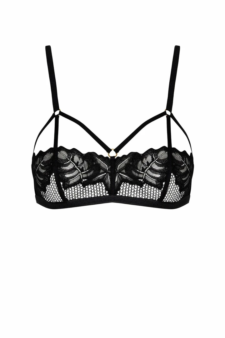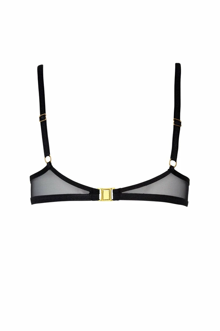 Bra made with Leavers lace, tulle, satin elastic straps and gold components. It has a suggestive design since it leaves parts of the breasts exposed.