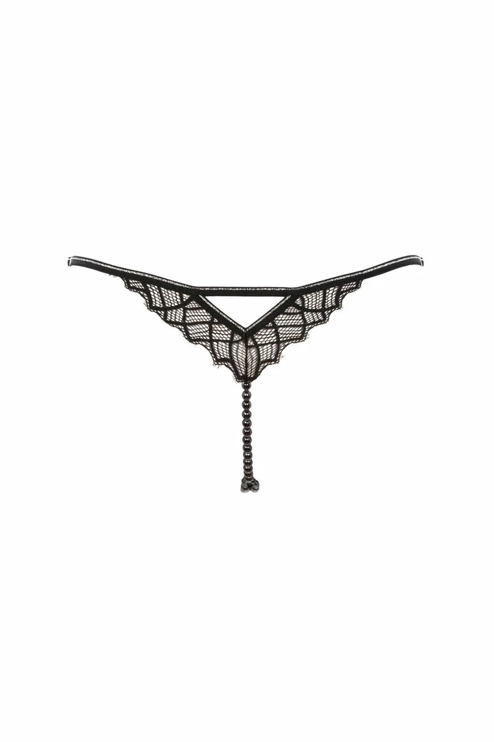 G-string made of recycled Italian lace, super sheer tulle, elastic silver lurex straps and silver appliquΓ©s that allow the garment to be adjusted to each body. The most provocative and surprising garment of the Manhattan Collection, thanks to its sheer and eye-catching back design.