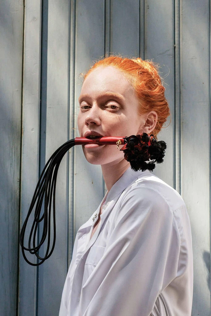This whip is presented as a bouquet with leather petals, waxed rope sheathed by leather.
