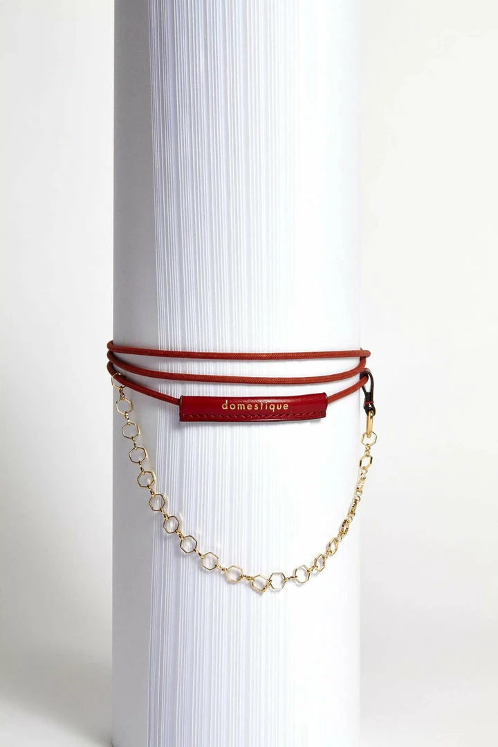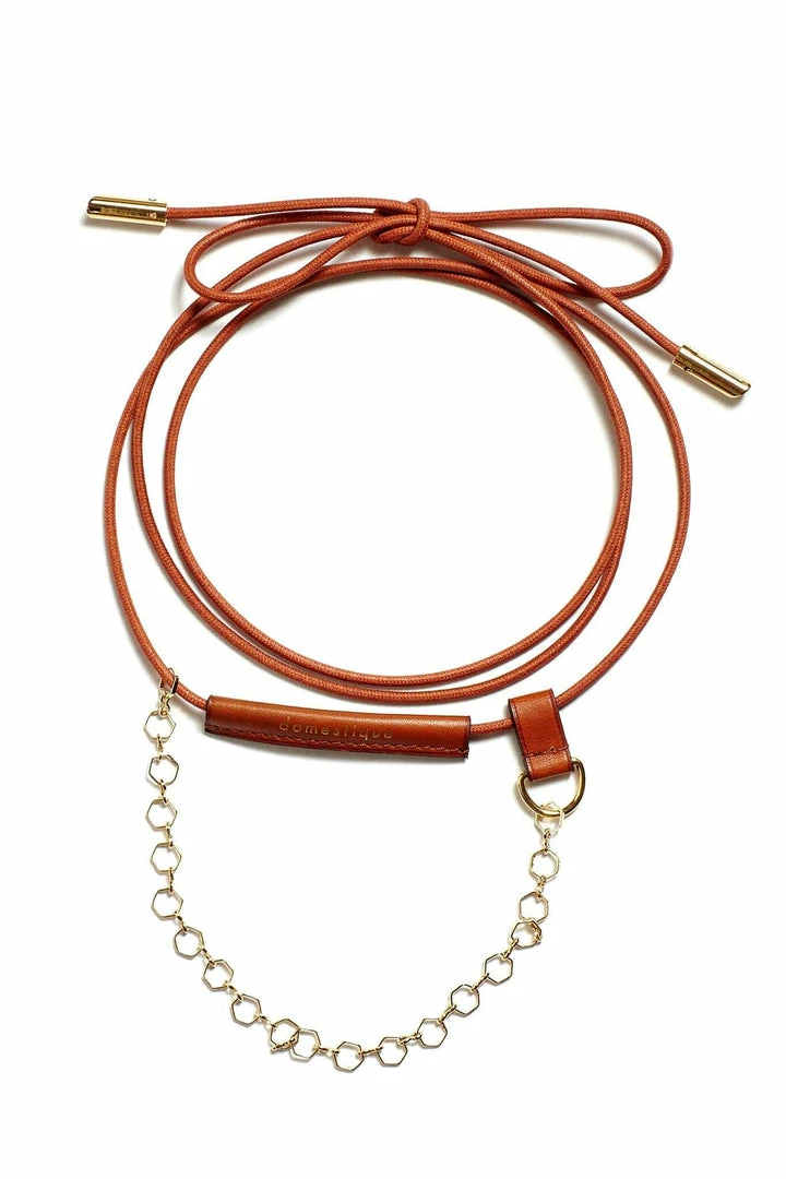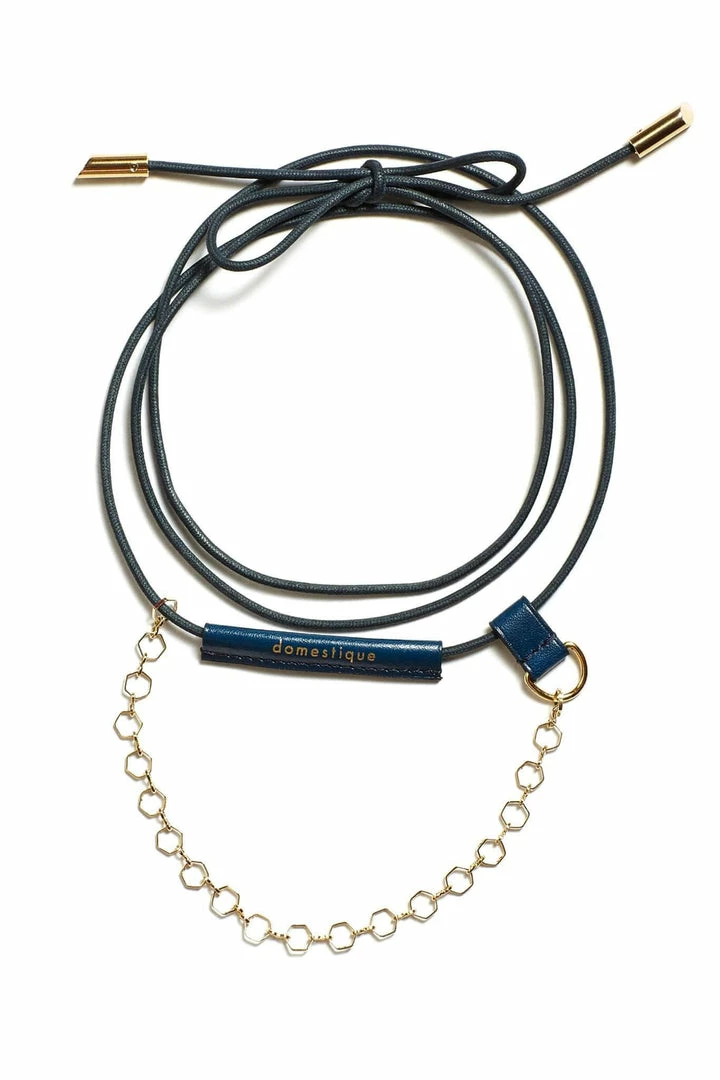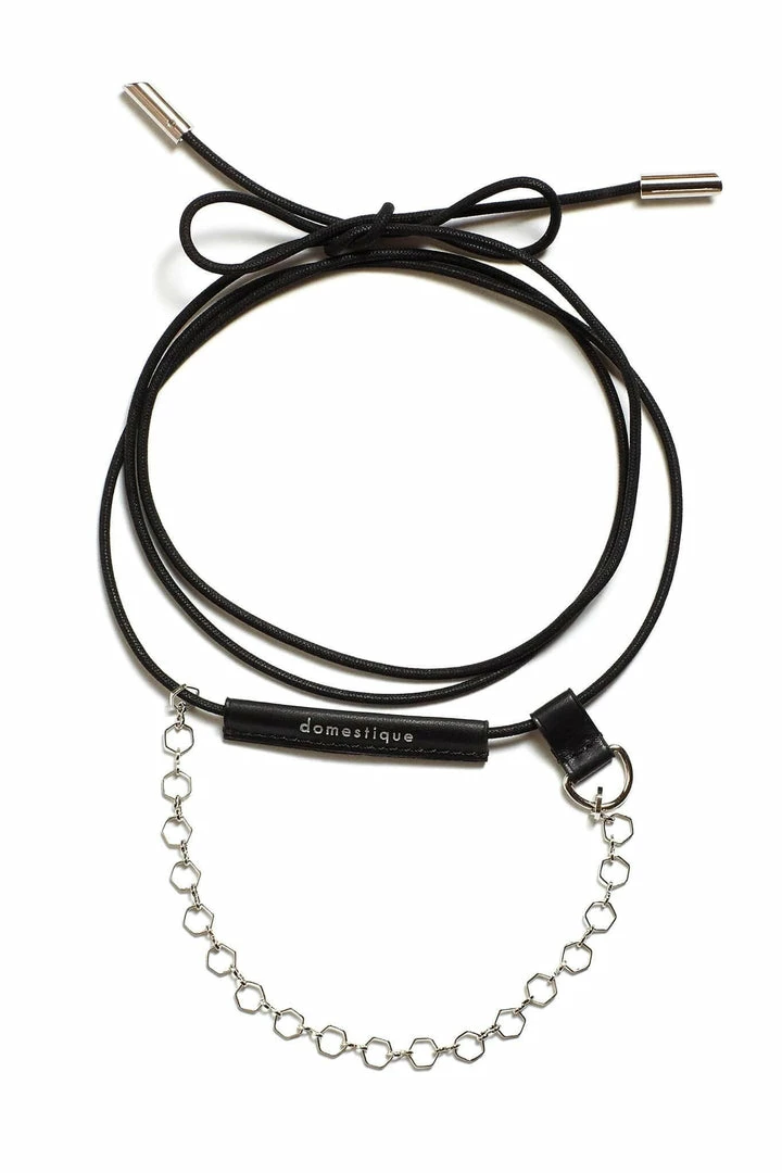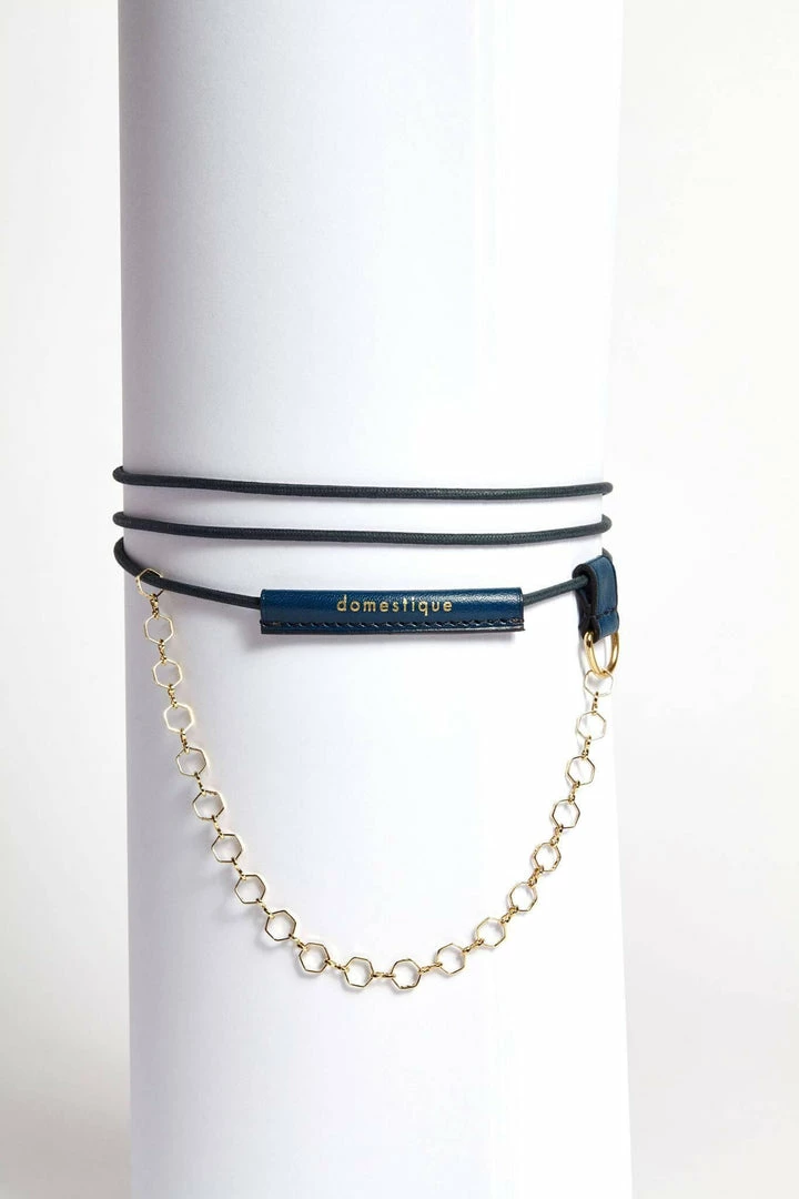 A triple twisted waxed rope with a thin plated chain. It can be worn on the neck, the wrist or the waist.