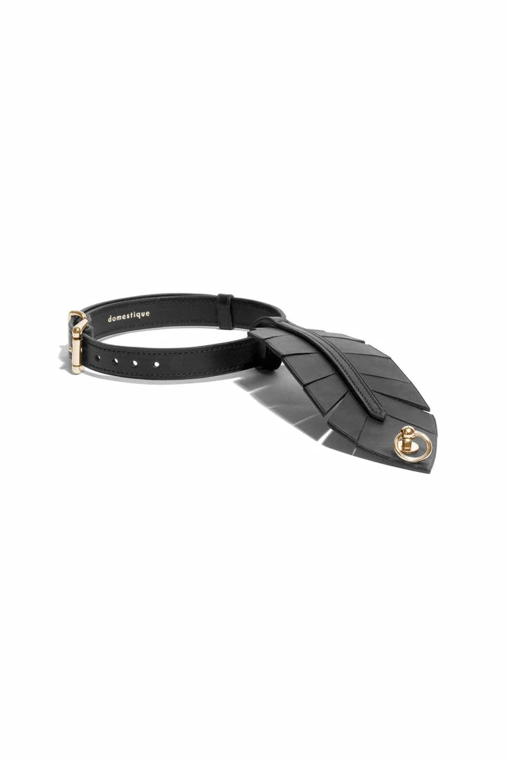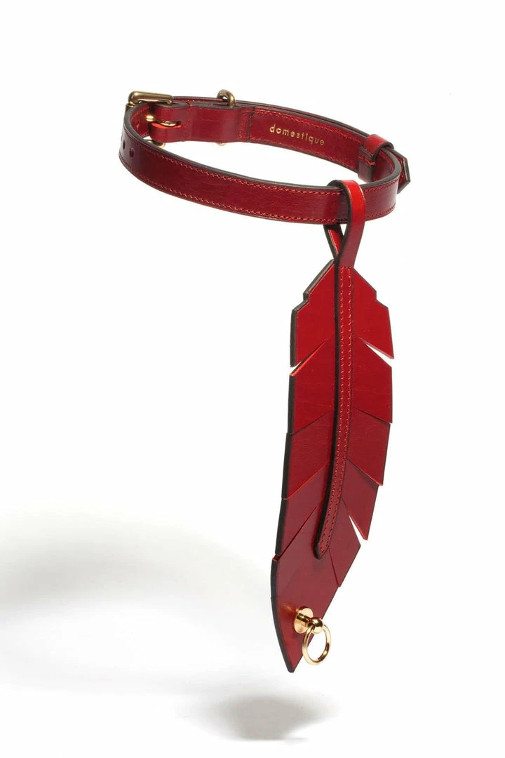 On a collar closed by an English buckle, a removable feather in natural tanned leather is secured. Itβs a playful accessory: the feather can be worn both around the throat or the neck, it becomes a leash when attached to the Pinson Belt.