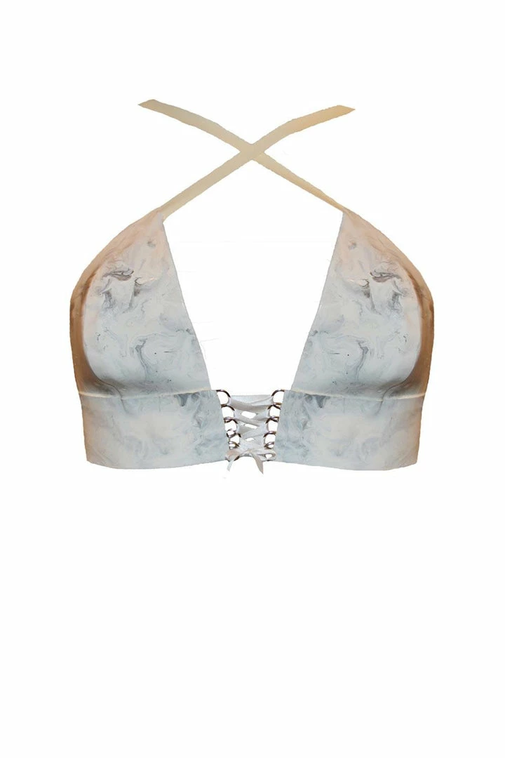 A soft bra feel with the ultimate lift and plunge style. Cross over straps enhance your assets whilst the lacing at the front allows you to be undressed with ease. Crafted in our signature beautiful white Marbletex® print. Pair with a sheer shirt for the ultimate tease.