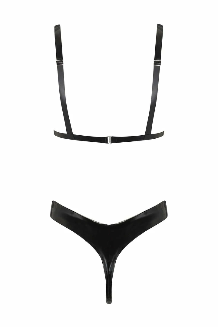A Latex Lingerie Set like you have never seen it before. Featuring two exaggerated diamanté appliqués to both triangle bra cups, jewel bra straps to match, and our exaggerated diamond appliqué on the Tau Thong for a show stopping effect.