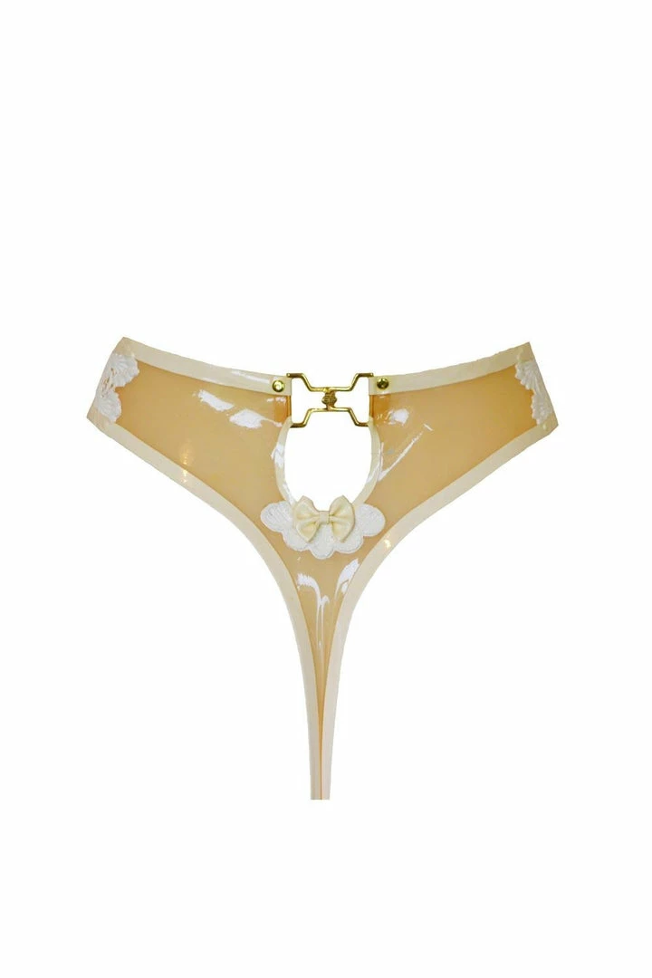 The Maia White Latex Thong sits high on the waist to create a flattering and beautiful shape. With a high leg cut and Lacetex® detailing it’s is clear to see why this style is a firm favourite. With Lacetex® embellishment used throughout and a keyhole feature to the back the Maia Thong creates a feminine yet strong look in any outfit.