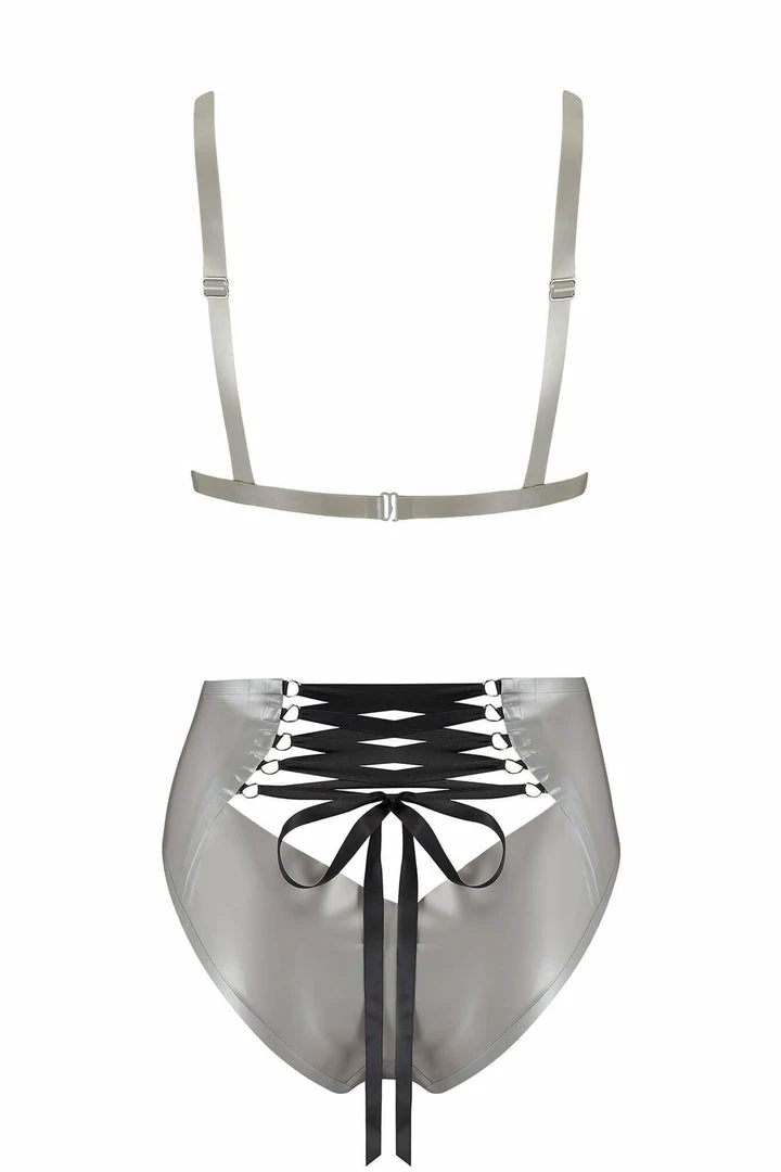 A LatexΒ Lingerie SetΒ like you have never seen it before. Featuring two exaggerated diamantΓ© appliquΓ©s to the Mu Triangle Bra, jewel bra straps to match, andΒ the high waisted Lambda Knicker tailored to perfection.