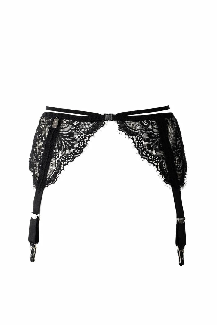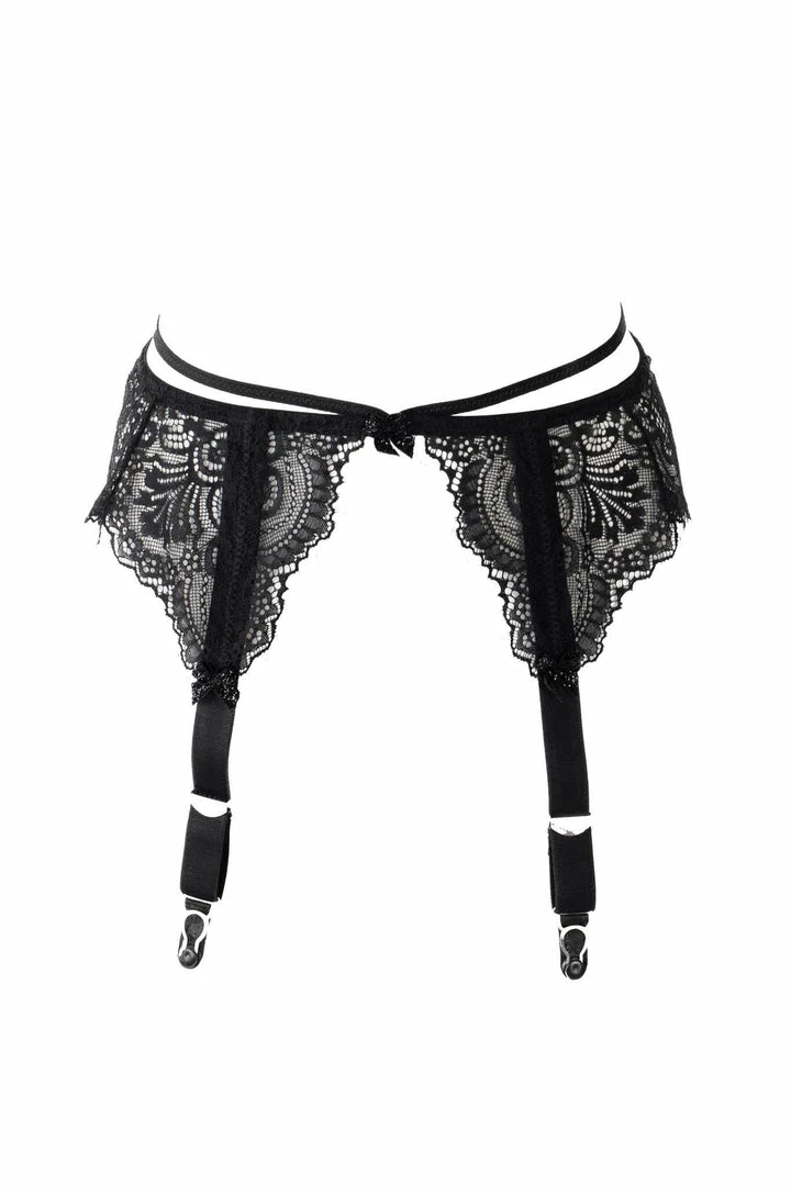 Black lacy garter belt, featuring black fringe lace to make it even more chic;Β featuring a shiny black bow on the front and a nickel-free Eros pendant on the back.