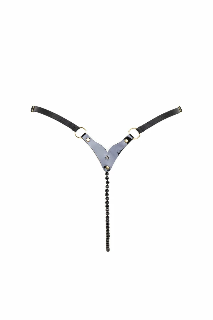 The ultimate sensual string! Our Leone Pearl String is handcrafted from Italian black patent leather, features a gold lion head and gold rivets. The luxurious center string is made from a strand of black glass pearls and adjustable double face satin elastic sides for easy size adjustments. Guaranteed to stimulate your senses!