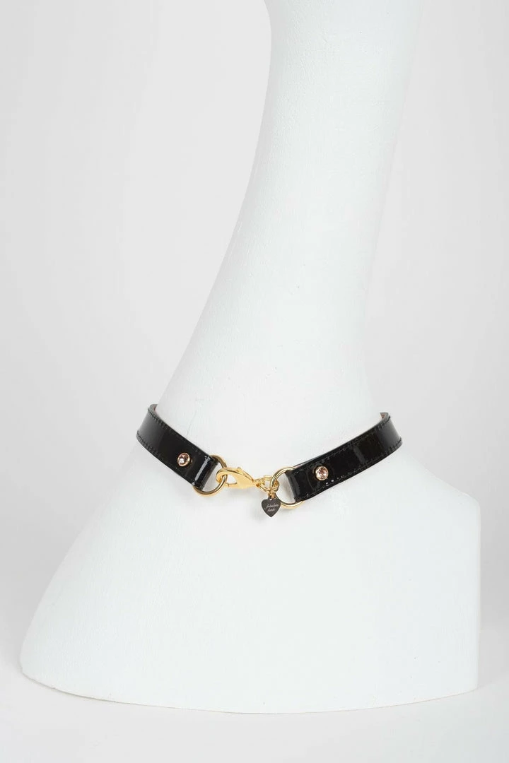 Our Nénette Leather Collar is an easy way to add a touch of high fashion glamour to a night out on the town! Handcrafted to order featuring Vintage Rose Crystal Rivet trimmings.