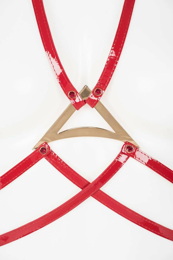 Hand crafted in our Berlin atelier, this is a true statement piece! Featuring shiny red patent leather lined with metallic gold leather, 18K gold plated metal trims, Swarovski® crystal rivets, and adjustable double face satin elastic for easy size adjustments. Style the harness over your favorite dress, blouse or on the skin and indulge yourself in luxury bondage!