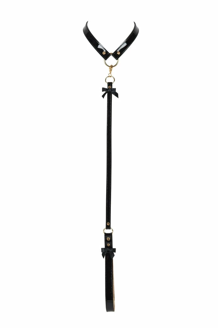 Super chic & sweet! Submit in style wearing out Jet Leather Leash. Featuring a detachable leather lead with gold crystal rivets & hand sewn black satin bow accents.