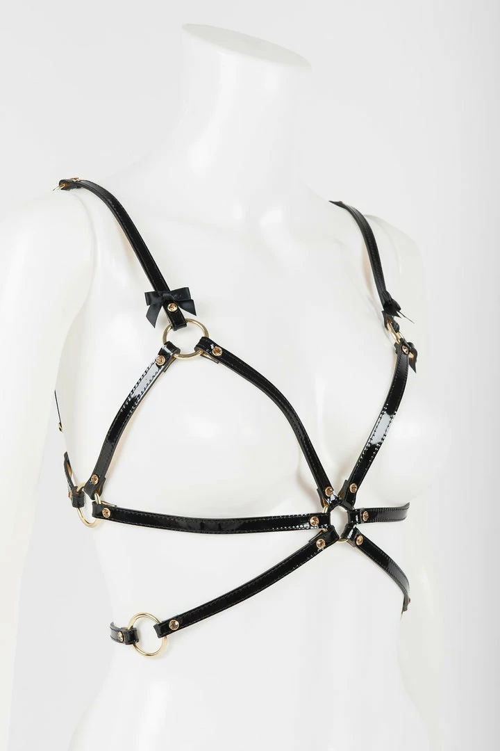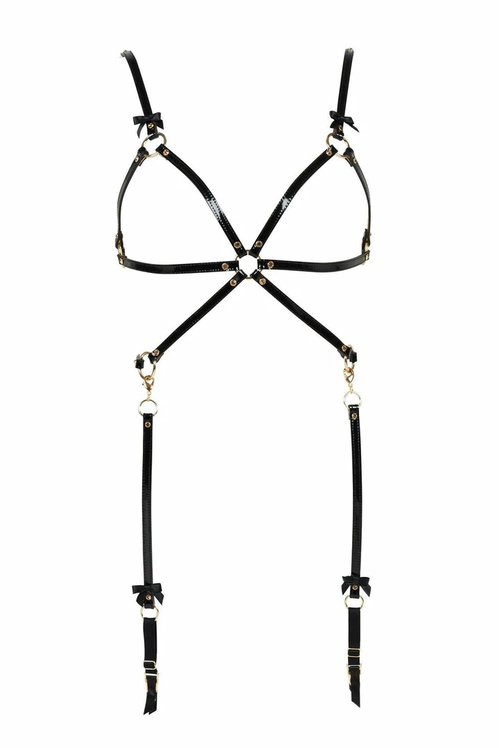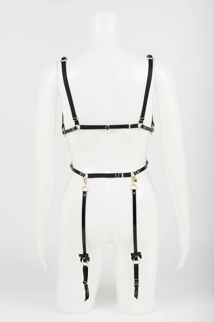 Unleash your inner Sex Kitten wearing our Jet Playsuit! Featuring detachable black & leather garters, gold crystal rivets, and hand sewn black satin bow details. Style this flirty playsuit with or without garters over your favorite fashion outfit.