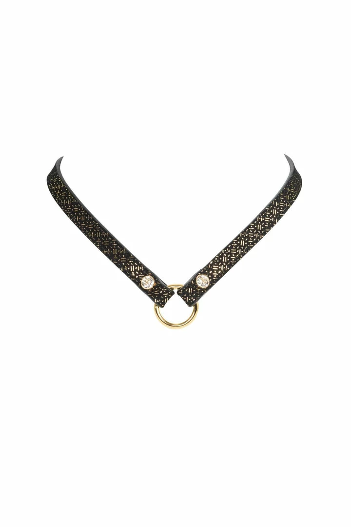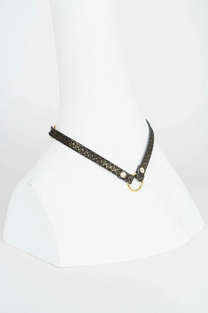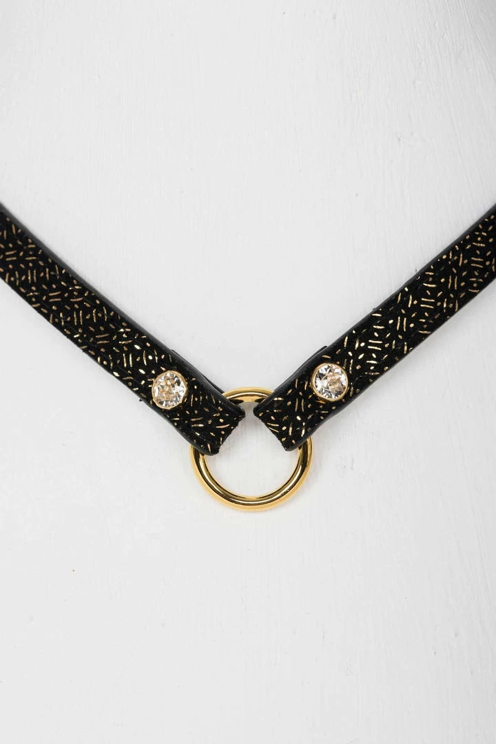 Handcrafted to order in our Berlin atelier, our Lush Skinny Collar is perfect to add a touch of high fashion glamour to your favorite outfit or for erotic role-playing inside the bedroom. Featuring chic black gold foil print leather, 18K gold trims and Swarovski® crystal rivets this is the ideal jewelry statement piece.