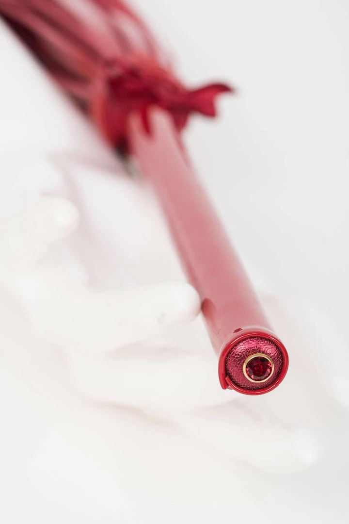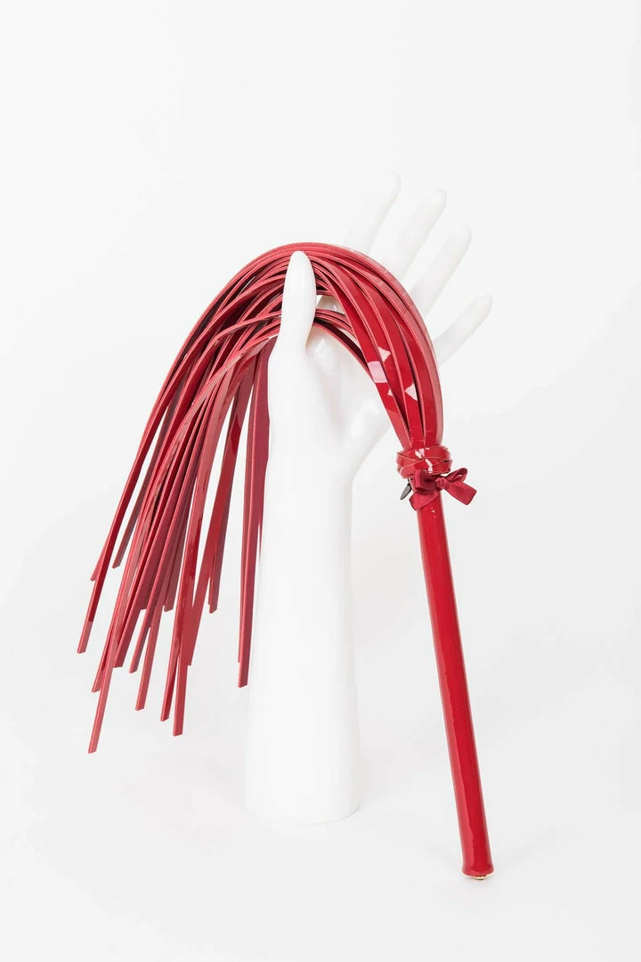 Excite and Tease with the ultimate luxury bedroom accessory! Our Red Hot Flogger is hand crafted from a mix of shiny red patent & metallic gold leathers. Swarovski® Red Siam Gold rimmed crystal rivets add the perfect finishing touches for this high fashion kinky accessory.