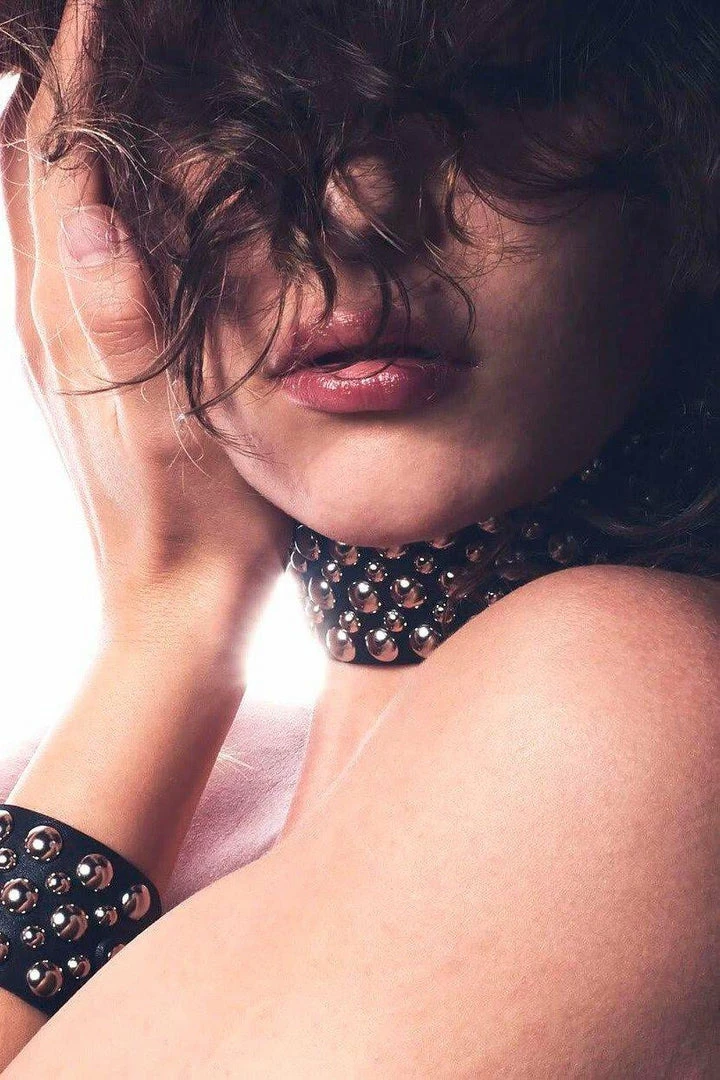 This easy to wear statement piece is made with comfortable, but sturdy 5/6oz leather that is hand studded with almost 100 dome cap rivets!