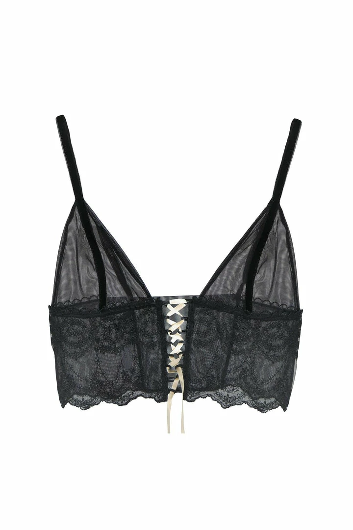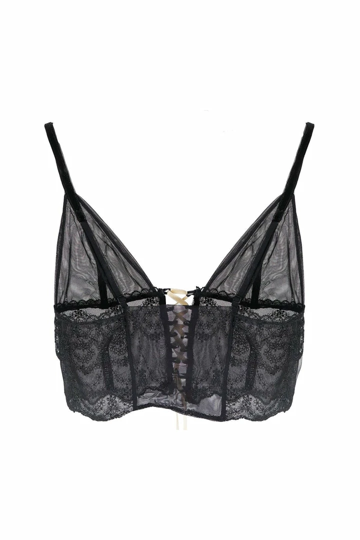 This exquisitely delicate longline bra from the Katrina collection has been crafted with signature Hot Couture embroidered tulle. Soft powernet tulle is detailed with captivating black velvet ribbon, while corsetry-inspired lace up fastening, features with an irresistible touch.
