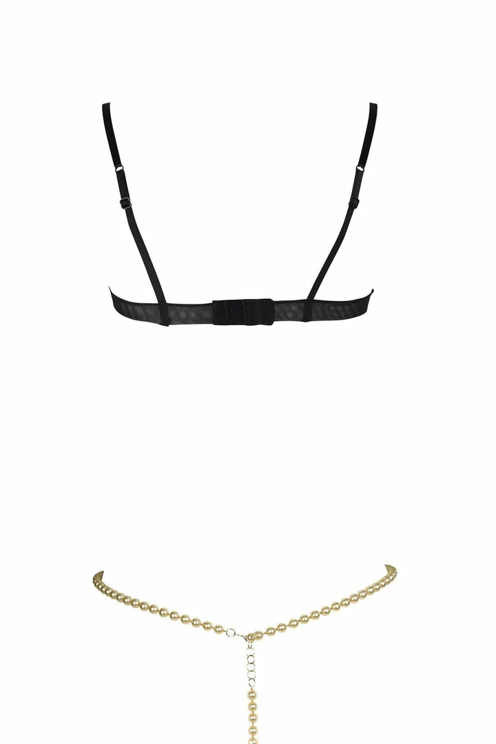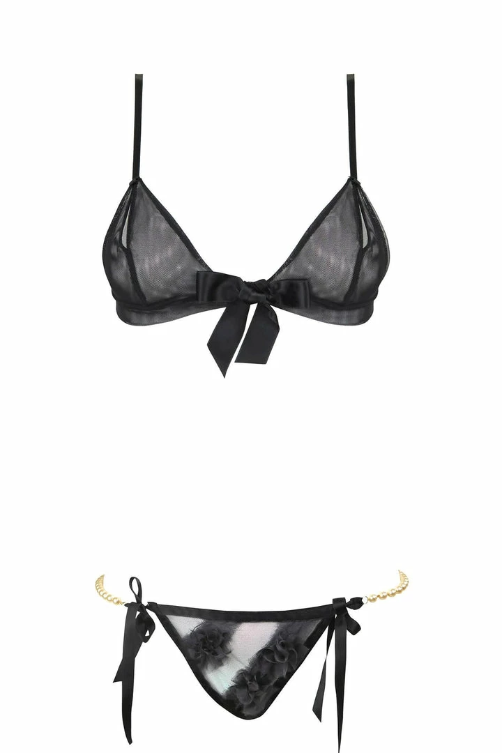 The Ava Bra is matched with the Ava Pearl Thong, made of stunning black string in sheer tulle and Swarovski crystal pearls. Silk chiffon bands layered on transparency create a very captivating mood, mixed with elegant flowers for a slightly sophisticated effect. Detailed with satin ribbon ties to either side and threads of elegant champagne coloured Swarovski crystal pearls, singularly hand knotted. An extremely sensual creation for unforgettable moments.