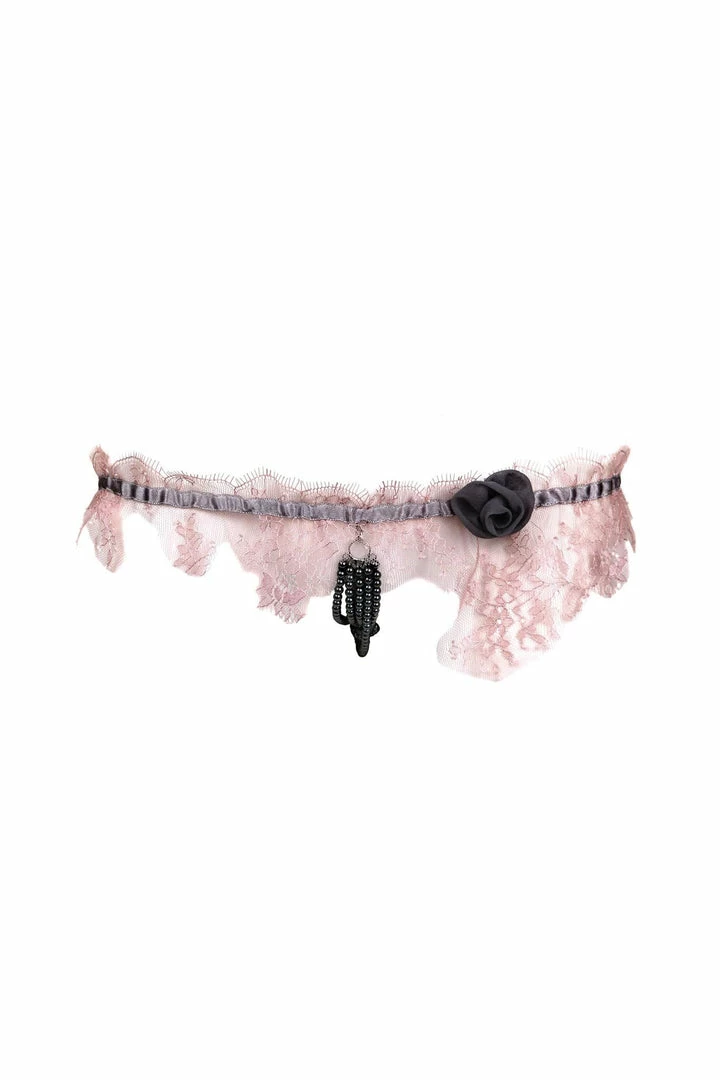 AΒ sheer, exquisite brief in a Brazilian thong cut, expertly crafted with signature Italian craftsmanship from the finest Italian Chantilly lace. Handmade chiffon rose and satin evocate ancient splendors while crystals fall in striking dark-grey lights.