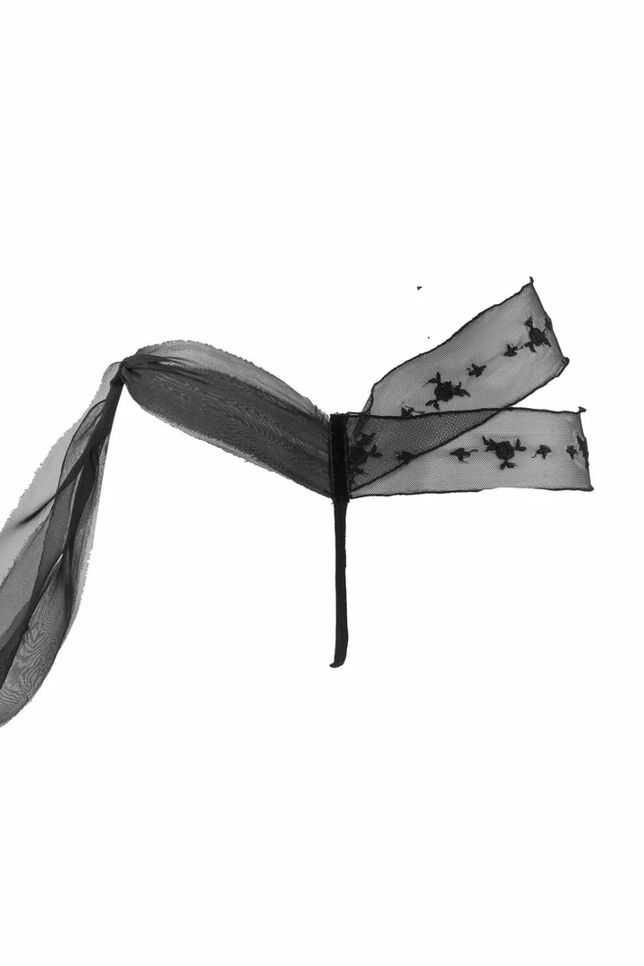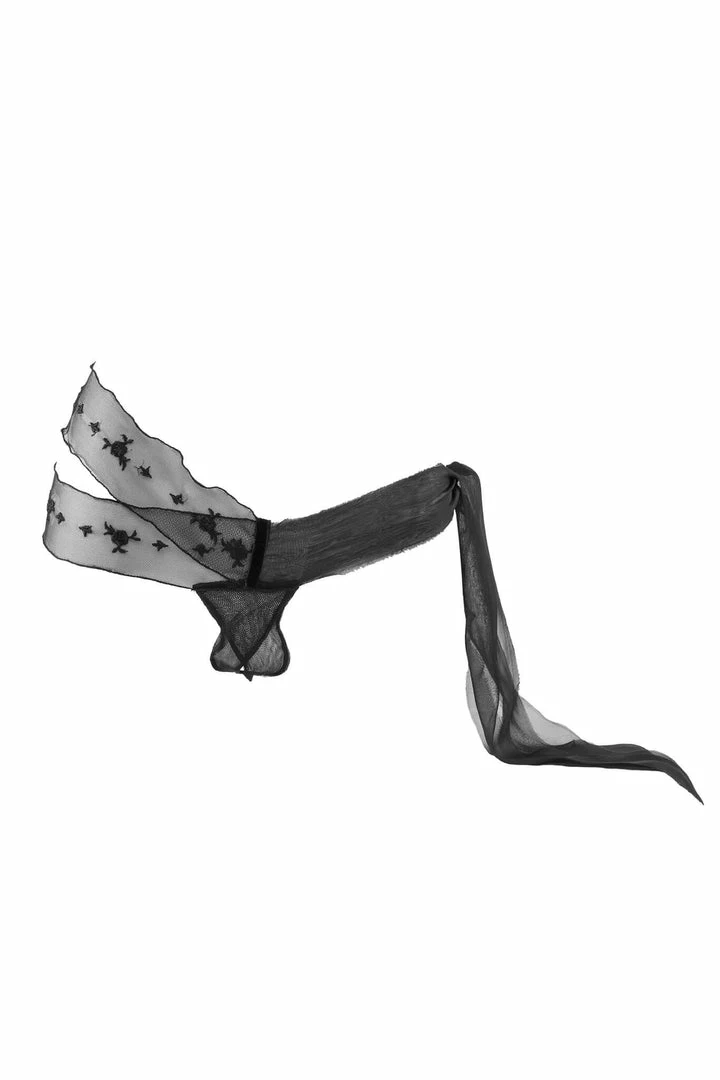 Asymmetrical thong in double layered organic intangible silk tulle. Overlaid bands of elasticated tulle embroidered with little roses motif, elegantly edged, which gently wraps the hips on a side with a very captivating effect. On the other side soft, raw-cut organic silk chiffon bands tie with a bow. Part of the Karin Lingerie Set