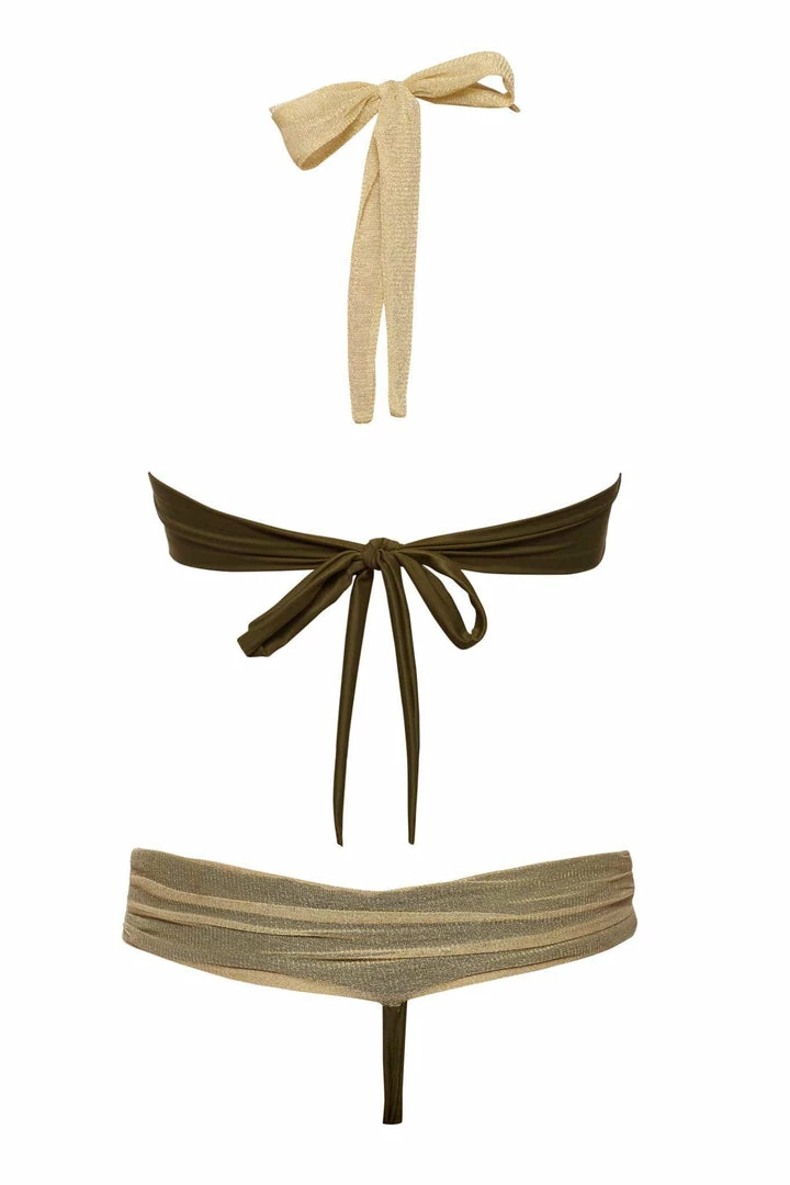 Golden net on deep green opaque Lycra mirror the effect of the sunlight playing between the pine trees and the water deep vegetation. Whether lounging by the pool or taking a dip, this swimwear feels effortlessly luxurious. The innovative high compact Lycra creates a soft, seamless fit against the body, ensuring a flattering fit.