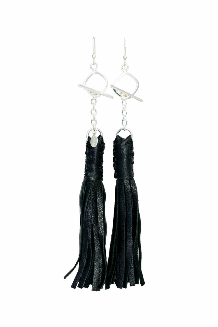 Dare to combine black leather and sterling silver in Lalitaβs original earring design. Inspire an all-occasion bold look with the hand-stitched leather tassel suspended from a chic silver diamond toggle. A favorite piece that also transforms from day to night by going between a simple and elegant sterling diamond drop to a tassel earring.