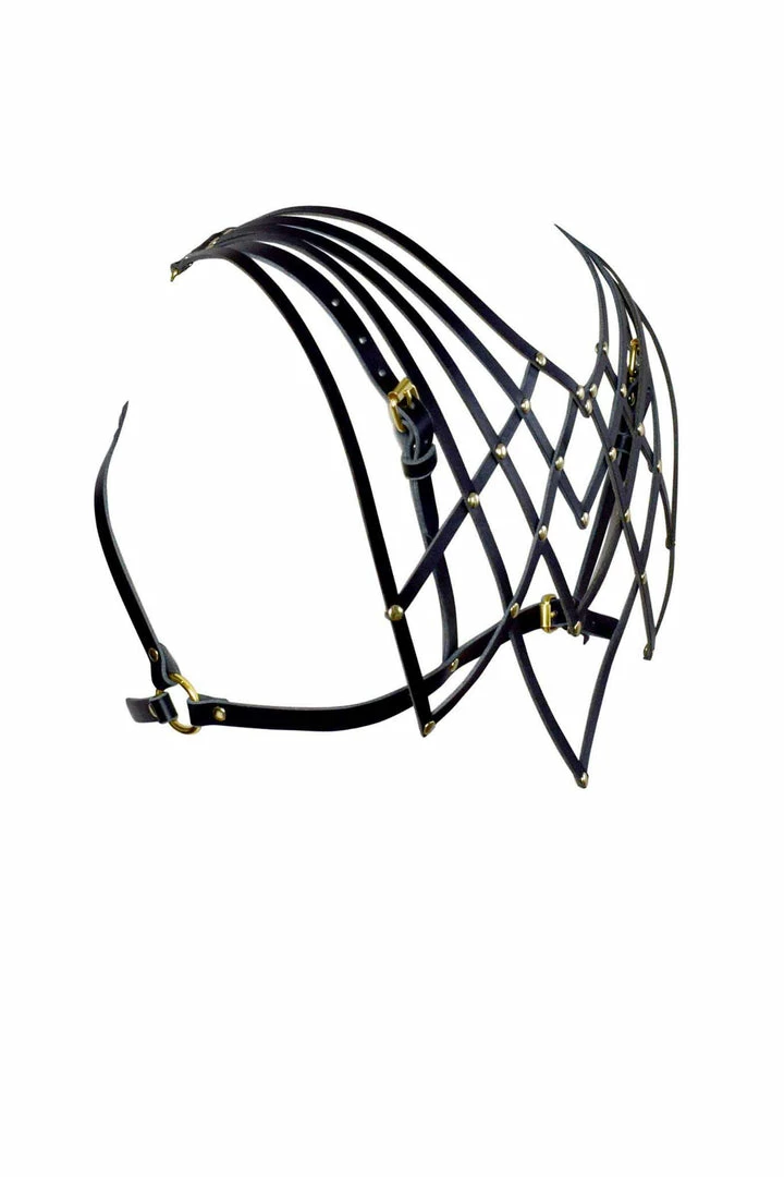 Leather harness bra with a removable Art-Deco inspired capelet at the back. Capelet attaches with small trigger clips, so it can be removed and attached elsewhere.