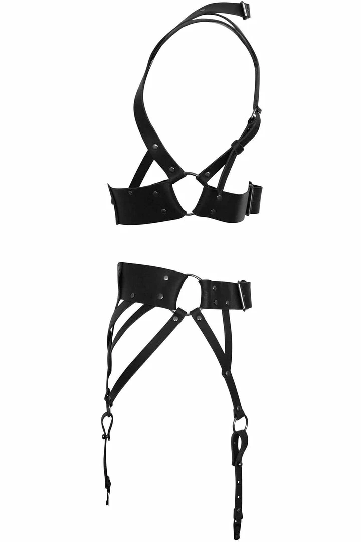 - Strappy leather straps form the βpeplumsβ that connect to garter straps