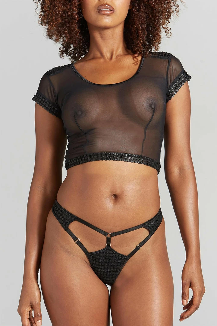 The Foxy Crop is a must have versatile silhouette framing the curves of your body daring to tease. Made of Italian sheer mesh combined with up cycled Austrian embroidery. Sleek and simple in its design, Foxy accents your shape go ahead and pair with high waist pants or skirt s for going out or with a kinky boudoir knickers when staying in.