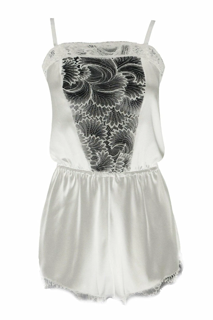 Our glamorous Pleasure Romper silhouette is as functional as it is sexually alluring. Provocative eyelash lace inserts and seductive placements paired with a luscious silk charmeuse accent the shape of the female form beautifully.
