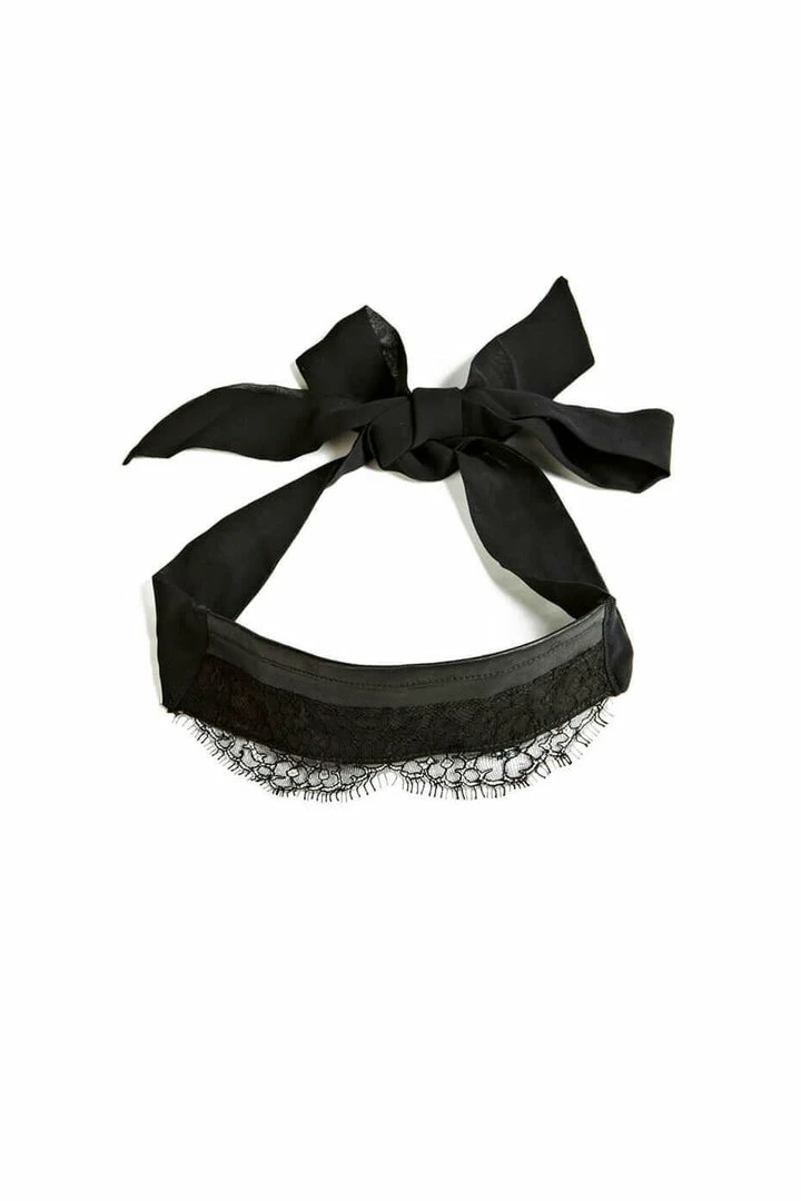 A divine hand-crafted leather and silk chiffon tie blindfold. Exquisitely detailed with French Chantilly lace.
