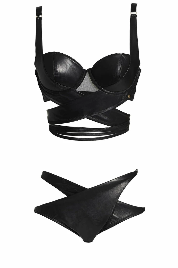 Made from our signature leather, this statement leather lingerie set has a bondage-inspired aesthetic allowing you to wrap yourself in leather strapping to create a fierce look that is equally exquisite as a piece of outerwear.
