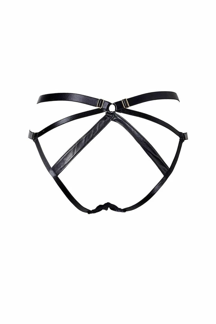 These Jade briefs will flatter yet tease at the same time. Bold leather strapping twists together to a central point to create a flattering shape from the front. The strap detail continues round the back to create a mouth wateringly bold design. Features adjustable waist straps.