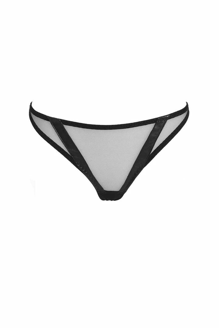 Leather binding and mesh design make the Nina thong a perfect piece to wear alone or with the Nina Suspender Garter.