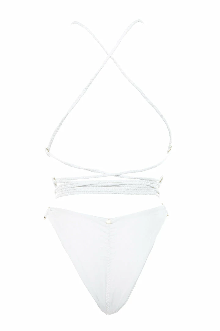 Plunging neckline with gold clasp and ring embellishment. Extra long braided strap woven through gold rings down the back for adjustable fit, this piece is made from the signature, supple, skin hugging Demery Jayne Collection fabric. One of a kind seamless style, with backless design, scrunch back bottom seam.
