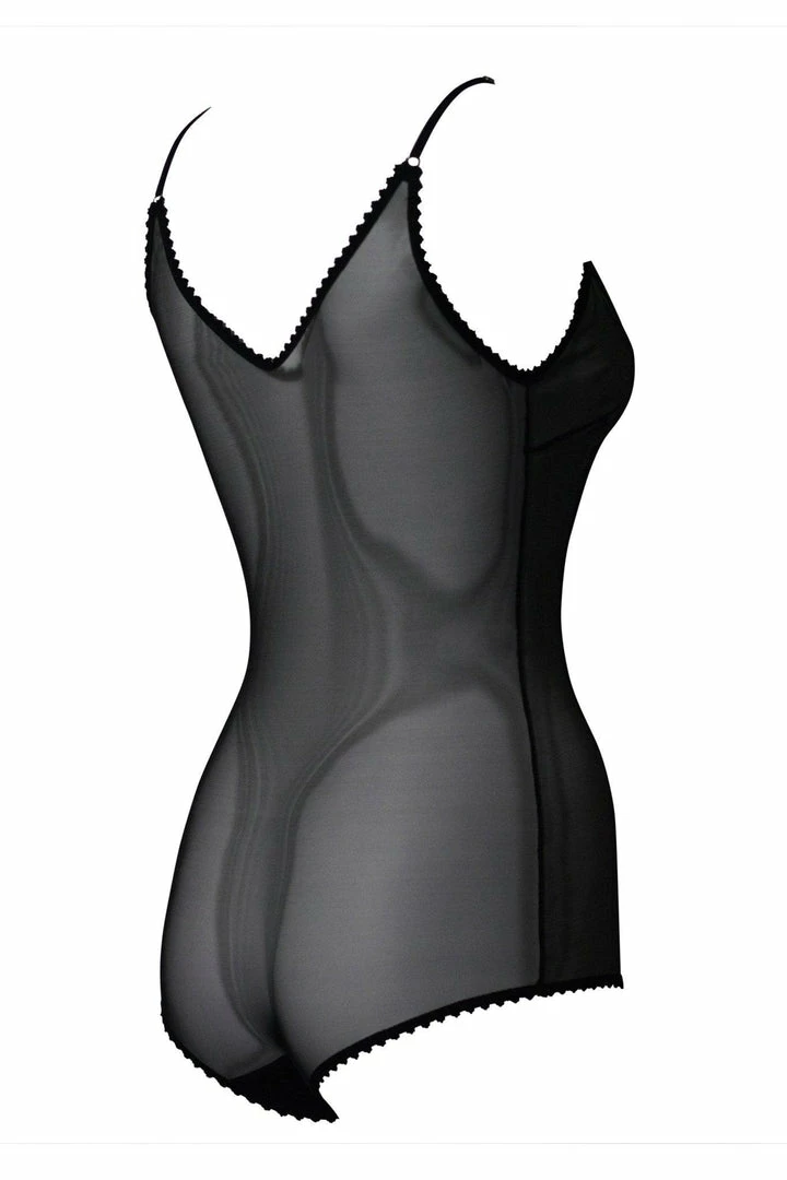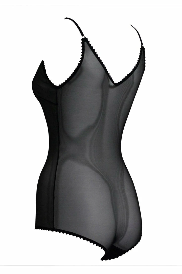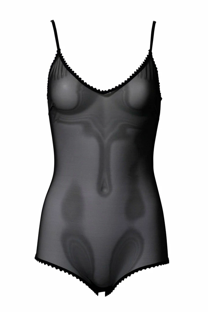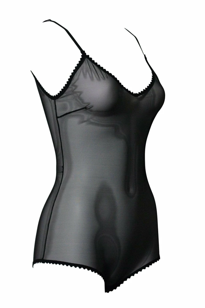 βVβ neck adjustable spaghetti strap bodysuit with cabaret leg line and picot edge elastic trim.