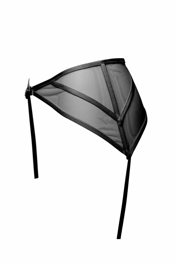 Sheer Italian net panels inset with boning and silver center front closure. Fully adjustable grosgrain elastic straps.
