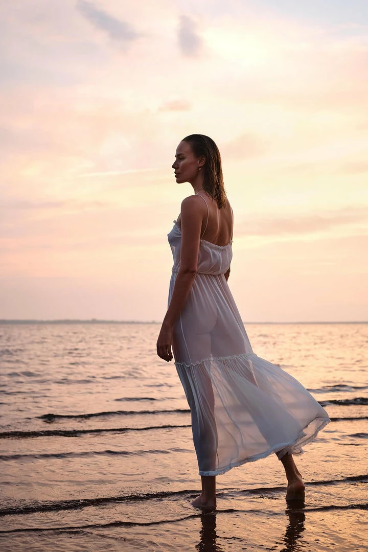 Chiffon nightgown with spaghetti straps, high low hem, and gathered tulle trim.
